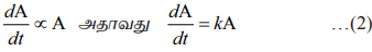 எனவே, தேவையான வகைக்கெழுச் சமன்பாடுdA/dt ∝A அதாவது dA/dt = kA …(2)