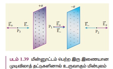 மின்புலம் சுழியாகும். ஆனால் தட்டுகளுக்கு இடையே உள்ள புள்ளிகளில் (P1)