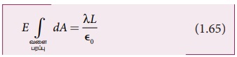 புள்ளி P இலிருந்து சம தொலைவில், கம்பியில் அமைந்துள்ள இரு சிறிய மின்துகள் கூறுகளை எடுத்துக்கொள்வோம் (படம் 1.36 (ஆ)) இவ்விரு மின் துகள் கூறுகளினால் உருவாகும் தொகுபயன் மின்புலமானது மின்னூட்டம் பெற்ற கம்பியிலிருந்து ஆர வழியே வெளிநோக்கிய திசையில் அமைகின்றது. மேலும், r ஆரமுடைய வட்டத்தின் அனைத்துப் புள்ளிகளிலும் அதன் எண்மதிப்பு சமமாக இருக்கும். இது படம் 1.36 (ஆ ) வில் காட்டப்பட்டுள்ளது. இந்தப் பண்பின் அடிப்படையில் மின்னூட்டம் பெற்ற கம்பி உருளை வடிவ சமச்சீர் தன்மை உடையது எனலாம். எனவே r ஆரமும் L நீளமும் கொண்ட உருளை வடிவ காஸியன் பரப்பைக் கருதுவோம். [படம் 1.37]