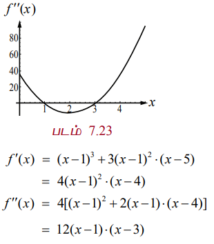 f"(x) -ன் குறியானது x = 1 மற்றும் x = 3 ஆகியவற்றைக் கடக்கும்போது மாறுகிறது. எனவே, (1, f (1)) = (1, 0) மற்றும் (3, f (3)) = (3,-16) ஆகியவை y = f (x) என்ற வளைவரையின் வளைவு மாற்றப்புள்ளிகள் ஆகும். குறிமாற்றத்தை அருகில் உள்ள f"(x) -ன் வரைபடத்தின் மூலம் அறியலாம்.