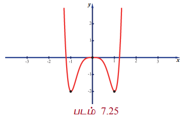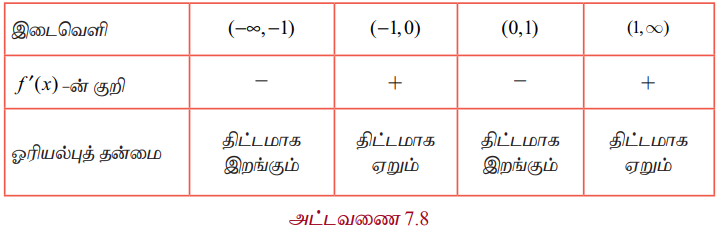 f" (-1) மற்றும் f"(1) ஆகியவை மிகை. ஆகவே இரண்டாம் வகைக்கெழு சோதனையின்படி, x = -1,1-ல் இடஞ்சார்ந்த சிறும மதிப்புகள் இருக்கும். ஆனால், x = 0 எனில், f"(0) = 0. x = 0 -ல் இரண்டாம் வகைக்கெழுச் சோதனையானது இடஞ்சார்ந்த அறுதி மதிப்புகளைப் பற்றி எந்த தகவலையும் தருவதில்லை. எனவே, நாம் முதலாம் வகைக்கெழு சோதனையை பயன்படுத்த வேண்டும். ஓரியல்புத்தன்மை இடைவெளிகள் அட்டவணை 7.8-ல் அட்டவணைப்படுத்தப்பட்டுள்ளது.