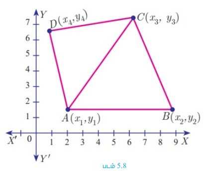 A(x1, y1), B(x2, y2), C(x3, y3) மற்றும் D(x4, y4) என்பன நாற்கரம் ABCD-யின் முனைப் புள்ளிகள் என்க.