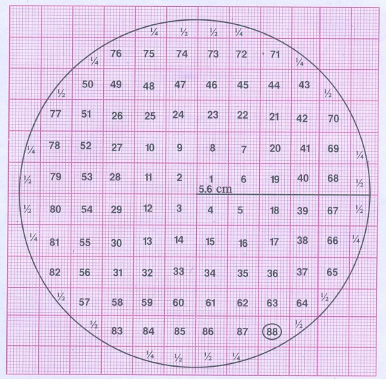 வட்டத்திற்குள் அடைபடும் சதுரங்களின் எண்ணிக்கை = 88 +16 × ½ +10 × ¼