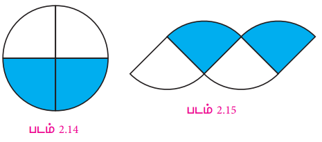 3. அந்த அரை வட்டத்தை மீண்டும் மடித்து, நான்கு கால்பகுதிகளாக்குக. (படம் 2.14) இல் வட்டமானது நான்கு கால் பகுதிகளாகப் பிரிக்கப்பட்டதைக் காட்டுகிறது. படம் 2.15 இல் உள்ள உருவம்போல, அந்த நான்கு கால்பகுதிகளையும் மாற்றி அமைக்கலாம்.