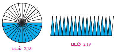 5. இவ்வாறு தொடர்ந்து செய்வதன்மூலம், அந்த வட்டம், 16 சமபாகங்களாகப் பிறகு 32 சம பாகங்களாக, உள்ளபடி பிரியும். சம பாகங்களின் எண்ணிக்கை அதிகரிக்க, அதிகரிக்க அதனை மாற்றி அமைப்பதால் உருவாகும் உருவம் படம் 2.19 இல் உள்ளது போல, ஏறத்தாழ, ஒரு செவ்வகமாகும்.