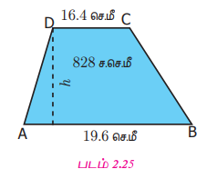 பரப்பளவு 828 ச.செ.மீ உம், இணைப்பக்க அளவுகள் 19.6 செ.மீ, 16.4 செ.மீ உம் கொண்ட சரிவகத்தின் உயரத்தை காண்க.