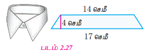 ஒரு சட்டையின் காலர் பகுதி இருசமபக்கச் சரிவகமாக உள்ளது. அதன் இணைப்பக்கங்கள் முறையே, 17 செ.மீ மற்றும் 14 செ.மீ, உயரம் 4 செ.மீ எனில், காலர் தைப்பதற்கு பயன்படுத்தப்படும் துணியின் பரப்பளவைக் காண்க.