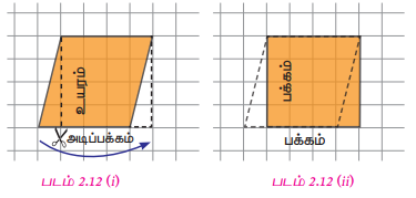 படம் 2.12(i)இல் காட்டியுள்ளவாறு ஒரு வரைபடத்தாளில் ஒரு சாய்சதுரத்தை வரைந்து அதை வெட்டி எடுத்துக்கொள்ள வேண்டும். ஒரு முனையிலிருந்து எதிர்ப்பக்கத்திற்கு ஒரு செங்குத்துக்கோடு வரைக. படம் 2.12(ii) இல் காட்டியுள்ளவாறு முக்கோணத்தை வெட்டிச் சாய்சதுரத்தின் மறு பக்கத்திற்குக் கொண்டு செல்க. தற்போது என்ன வடிவம் கிடைத்துள்ளது? அது ஒரு சதுரம். சாய்சதுரத்தின் பரப்பளவு சதுரத்தின் பரப்பளவிற்குச் சமமாக இருக்கும்.