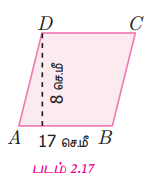 பக்க அளவு 17 செ.மீ மற்றும் உயரம் 8 செ.மீ கொண்ட சாய்சதுரத்தின் பரப்பளவு காண்க.