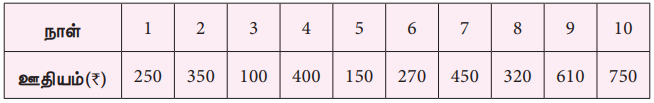 ஒரு தொழிலாளியின் தினசரி ஊதியம், 10 நாள்களுக்குப் பின்வருமாறு தரப்பட்டுள்ளது எனில், அவரது சராசரி வருமானத்தைக் கண்டுபிடி.