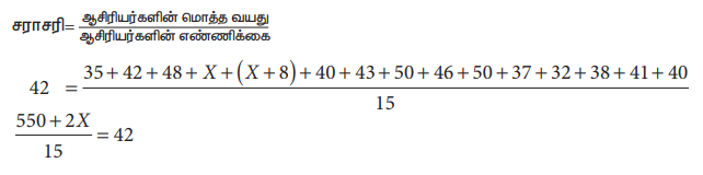 ஒரு பள்ளியிலுள்ள 15 ஆசிரியர்களின் சராசரி வயது 42 ஆகும். அந்த ஆசிரியர்களின் வயதானது 35, 42, 48, X, X + 8, 40, 43, 50, 46, 50, 37, 32, 38, 41 மற்றும் 40 (ஆண்டுகளில்) ஆகும் எனில், X இன் மதிப்பைக் கண்டுபிடித்து, ஆசிரியர்களின் வயதுகளையும் காண்க.