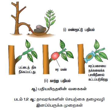 இ) பதியம் போடுதல் (Layering): இம்முறையில் பெற்றோர் தாவரத்தின் தண்டு தாவரத்தோடு ஒட்டியிருக்கும் போது அதிலிருந்து வேர்கள் தோன்றுவதற்கு தூண்டப்படுகிறது. வேர் தோன்றிய பின் வேர் பகுதி வெட்டி நீக்கப்பட்டு புதிய தாவரமாகிறது. எடுத்துக்காட்டுகள்: இக்சோரா மற்றும் ஜாஸ்மினம். மண்முட்டு பதியம் மற்றும் காற்று பதியம் போன்றவை சில வகை பதியங்களாகும் (படம் 1.2 ஆ)