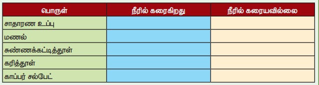 அளிக்கின்றன. ஆனால் மணல், சுண்ணக்கட்டித் தூள் மற்றும் கரித்தூள் ஆகியவை நீரில் கரையவில்லை.