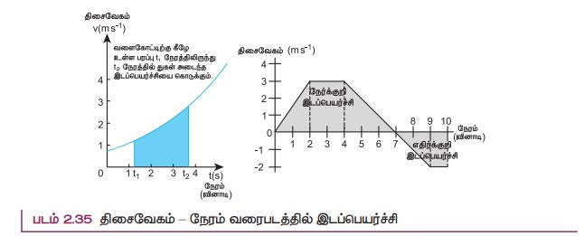 இடதுகைப் பக்கமுள்ள தொகையிடல் t1 நேரத்திலிருந்து t2 நேரத்தில் துகள் அடைந்த இடப்பெயர்ச்சியைக் குறிக்கிறது. திசைவேகம் - நேரம் வளை கோட்டிற்கு கீழே உள்ள பரப்பு துகளின் இடப்பெயர்ச்சியைக் குறிக்கிறது. பரப்பு எதிர்க்குறியாக இருப்பின், இடப்பெயர்ச்சி எதிர்க்குறி ஆகும். எனவே, துகள் எதிர்த்திசையில் செல்கிறது. இது படம் 2.35 இல் காட்டப்பட்டுள்ளது.