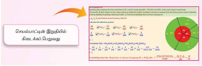 "Bayes Theorem" என்பதைத் தேர்ந்தெடுக்கவும். அதில் ஒரு எடுத்துக்காட்டுகள் கொடுக்கப்பட்டிருக்கும். கொடுக்கப்பட்டிருக்கும் படிகளின் படி நிகழ்தகவுகளைச் செய்க. உங்கள் விடைகளைச் சரி பார்க்க, அதற்கென கொடுக்கப்பட்டிருக்கும் கட்டங்களைச் சொடுக்குக.