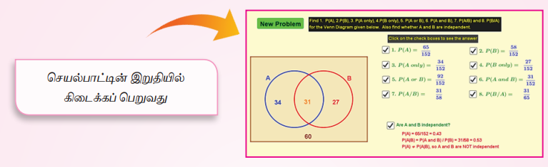 "Sets and Probability" என்பதைத் தேர்ந்தெடுக்கவும். அதில் "New Problem" என்பதைத் தேர்வு செய்து, வினாக்களை மாற்ற முடியும். நிகழ்தகவு கணக்குகளைச் செய்து, அதற்கென கொடுக்கப்பட்டிருக்கும் கட்டங்களைச் சொடுக்குக.