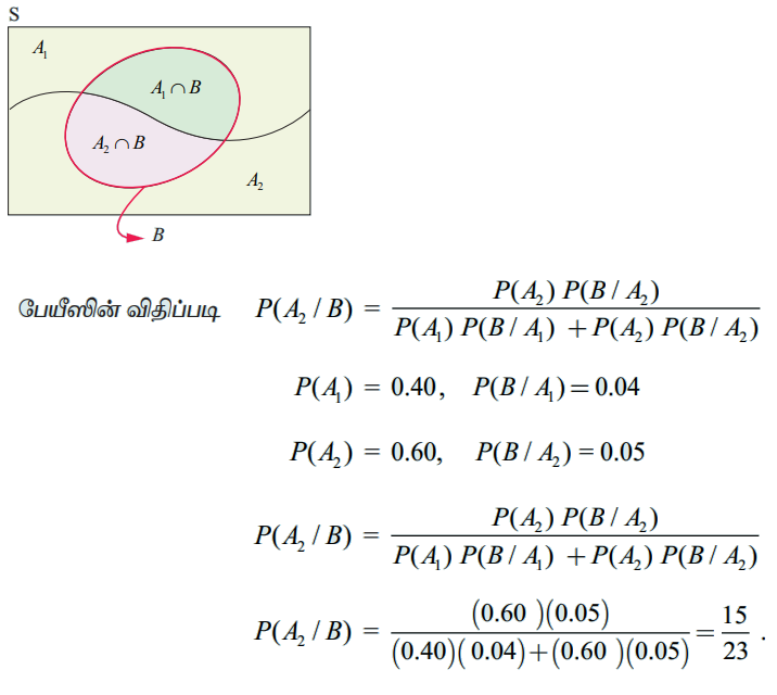 A1 மற்றும் A2 முறையே இயந்திரங்கள்-I மற்றும் II மூலம் உற்பத்தி செய்யப்பட்ட பொருள்களின் நிகழ்ச்சி என்க. B என்பது குறைபாடுள்ள ஒரு பொருளை தேர்ந்தெடுப்பதற்கான நிகழ்ச்சி என்க. P(A2/B) எனும் நிகழ்தகவைக் காணவேண்டும். A1, A2 என்பவை ஒன்றையொன்று விலக்கிய மற்றும் யாவுமளாவிய நிகழ்ச்சிகள் ஆகும்.