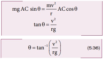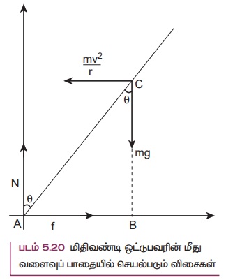 r ஆரம் கொண்ட சமமான வட்டப் பாதையில் v திசைவேகத்துடன் மிதிவண்டி ஒட்டுபவர் கடக்க முயற்சிக்கும்போது கீழே விழாமல் சமநிலையில் இருக்க θ கோணம் சாய்ந்த நிலையில் கடக்க வேண்டும்.