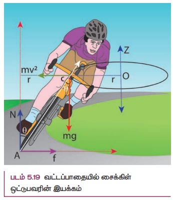 மிதிவண்டி ஓட்டுபவர் சமநிலையில் r ஆரம் உள்ள வட்டப்பாதையில் (உயர்த்தப்படாத பாதையில்) v வேகத்துடன் செல்ல முயற்சிப்பதாகக் கருதுவோம். மிதிவண்டி மற்றும் ஒட்டுபவரையும் சேர்த்து m நிறை கொண்ட ஒரே அமைப்பாகக் (simple system) கருதுவோம். இவ்வமைப்பின் நிறைமையம் C மற்றும் இது O வை மையமாக கொண்டு r ஆரம் கொண்ட வட்டப் பாதையில் செல்கிறது. படம் 5.19 இல் காட்டியுள்ளவாறு OC யை X அச்சாகவும், O- வழியே செல்லும் செங்குத்துக் கோடு OZ-ஐ Z-அச்சாகவும் கொள்வோம்.