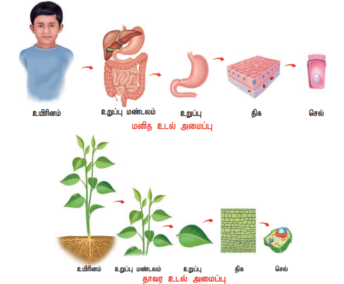 பல செல்கள் ஒன்றாகச் சேர்ந்து திசுவை உருவாக்க, வெவ்வேறு திசுக்கள் ஒன்றாகச் சேர்ந்து உறுப்பை உருவாக்க, வெவ்வேறு உறுப்புக்கள் ஒன்றாகச் சேர்ந்து உறுப்பு மண்டலத்தை உருவாக்க, உறுப்பு மண்டலம் உயிரினத்தின் பல்வேறு பணிகளை மேற்கொள்கிறது.