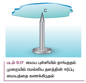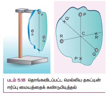 ஒழுங்கற்ற மெல்லிய பொருட்களின் ஈர்ப்பு மையத்தினை மற்றொரு முறையின் மூலமும் கண்டறியலாம். பொருளானது P, Q, R என்ற வெவ்வேறான புள்ளிகளில் படம் 5.18 இல் காட்டியுள்ளவாறு தொங்கவிடப்படுகிறது எனில், PP', QQ', RR' ஆகிய குத்துக் கோடுகள் அனைத்தும் ஈர்ப்பு மையம் வழியாக செல்கிறது. இங்கு பொருள் தொங்கவிடப்பட்ட புள்ளியில் செயல்படும் எதிர் விசையும் நிறைமையத்தின் மீது செயல்படும் புவியீர்ப்பு விசையும் ஒன்றை ஒன்று சமன் செய்கிறது. மேலும் இவற்றால் ஏற்படும் திருப்பு விசைகளும் குத்து கோடுகளின் மீது உள்ள போது ஒன்றை ஒன்று சமன் செய்கிறது.