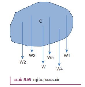 திண்மப் பொருட்கள் அனைத்தும் பல புள்ளி நிறைகளால் ஆக்கப்பட்டுள்ளது. புள்ளி நிறைகள் அனைத்தும் புவியின் மையத்தை நோக்கிய ஈர்ப்பியல் விசையினை உணர்கிறது. நடைமுறை வாழ்வில் எந்தவொரு திண்மப் பொருளின் அளவை விட புவி மிக பெரியதாக இருப்பதால் இவ்விசைகள் அனைத்தும் கீழ்நோக்கி இணையாக செயல்படுவதாக நாம் கருதலாம். இது படம் 5.16 இல் காட்டப்பட்டுள்ளது.