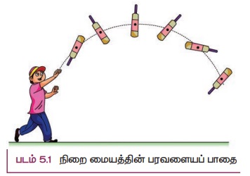பொருளொன்று (கிரிக்கெட் மட்டை-bat) காற்றில் குறிப்பிட்ட கோணத்தில் எறியப்படும் போது நிறைமையம் செல்லும் பாதை படம் 5.1 இல் காட்டப்பட்டுள்ளது. மட்டையின் அனைத்துப் புள்ளிகளும் பரவளையப் பாதையை மேற்கொள்கின்றனவா? உண்மையில் ஒரே ஒரு புள்ளி மட்டுமே பரவளையப் பாதையையும் மற்ற புள்ளிகள் வெவ்வேறு பாதையையும் மேற்கொள்ளும்.