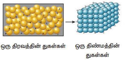 ஒரு திரவத்தினை குளிர்விக்கும்பொழுது, அதன் துகள்கள் ஆற்றலை இழந்து அதனால் அதிர்வடைவதன் வேகமும் குறைகிறது. துகள்களுக்கு ஆற்றல் குறைவாக இருப்பதால் அவை ஒன்றையொன்று அதிகமாய் ஈர்த்து, நெருங்கி வர வாய்ப்புள்ளது. எனவே, அத்துகள்களின் நகர்தலும் குறைவாகவே இருக்கிறது. எடுத்துக்காட்டாக, திரவ நிலையிலுள்ள நீர் 0°C க்கு குளிர்விக்கப்படும்பொழுது, அது உறைந்து பனிக்கட்டியாகிறது. உறைநிலையை அடைந்தவுடன் அனைத்து திரவமும் உறைந்து திண்ம நிலையை அடைகிறது. திரவ நிலையிலும் திண்ம நிலையிலும் உள்ள துகள்களின் அமைப்பை பின்வரும் படத்தில் காணலாம்.