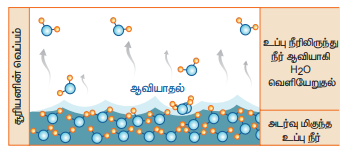 நிலத்தில் படிகிறது. ஒரு கரைசலில் உள்ள கரைப்பான் எந்த வெப்பநிலையிலும் அதிலுள்ள திண்மத்தை விட்டு ஆவியாகி வெளியேறும் என்ற தத்துவத்தின் அடிப்படையில் நம்மால் ஆவியாதலைப் புரிந்து கொள்ள முடியும்.