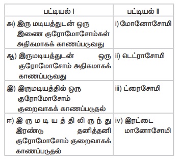 இ) இரு மடியத்தில் ஒரு குரோமோசோம் குறைவாக காணப்படுதல் - iii ட்ரைசோமி
