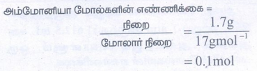 அம்மோனியா மோல்களின் எண்ணிக்கை = நிறை /மோலார் நிறை = 1.7g /17gmol−1