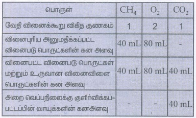 1. 40 மி.லி மீத்தேன் வாயுவானது 80 மி.லி ஆக்சிஜனைக் கொண்டு முழுமையாக எரிக்கப்படுகிறது. அறை வெப்பநிலைக்கு குளிர்விக்கப்பட்ட பிறகு எஞ்சியுள்ள வாயுவின் கனஅளவு