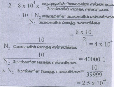 5. 350 K வெப்பநிலையில் நீரில், நைட்ரஜன் வாயுவின் கரைதிறனுக்கு ஹென்றி விதி மாறிலி மதிப்பு 8 × 104 atm. காற்றில் நைட்ரஜனின் மோல் பின்னம் 0.5 ஆகும். 350K வெப்பநிலை மற்றும் 4 atm அழுத்தத்தில் 10 மோல்கள் நீரில் கரையும் காற்றிலுள்ள நைட்ரஜனின் மோல் எண்ணிக்கை