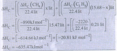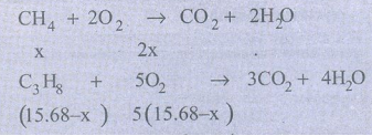 கலவையானது x லிட்டர் மீத்தேனையும் (15.68 − x) லிட்டர் புரப்பேனையும் கொண்டு இருப்பதாகக் கருதுக.
