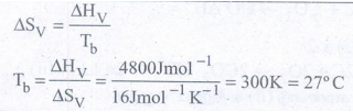 Тb = ΔΗV / ΔSV = 4800Jmol−1 /16Jmol−1K−1 = 300K = 27° C