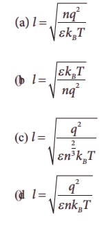 15. ஒர் அளவின் நீளம் (l) மின்காப்பு பொருளின் விடுதிறன் (ε) போல்ட்ஸ்மேன் மாறிலி (kB). தனிச்சுழி வெப்பநிலை (T), ஓரலகு பருமனுக்கான மின்னூட்ட துகள்களின் எண்ணிக்கை (n), ஒவ்வொரு துகளின் மின்னூட்டம் (q) ஆகியவற்றினை பொருத்தது எனில் கீழ்கண்டவற்றுள் நீளத்திற்கான எந்த சமன்பாடு பரிமாண முறையில் சரி?