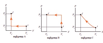 9. நல்லியல்பு வாயு ஒன்று (Pi, Vi) என்ற தொடக்க நிலையிலிருந்து (Pf , Vf) என்ற இறுதிநிலைக்கு பின்வரும் மூன்று வழிமுறைகளில் கொண்டு செல்லப் படுகிறது. எவ்வழி முறையில் வாயுவின் மீது பெரும் வேலை செய்யப்பட்டிருக்கும்?