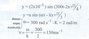 9. x திசையில் இயங்கிக் கொண்டுள்ள அலை ஒன்றின் இடப்பெயர்ச்சி y இதற்கான சமன்பாடு y = (2 × 10-3) sin (300t - 2x + π/4) இங்கு x, y மீட்டரிலும் t வினாடியிலும் அளக்கப்பட்டால் அலையின் வேகம்