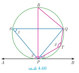 ∠QPB (∠1) -யின் மாற்று வட்டத் துண்டில் உள்ள கோணம் ∠QSP (∠1) ஆகும். மற்றும் ∠QPA (∠2) -யின் மாற்று வட்டத்துண்டிலுள்ள கோணம் ∠PTQ (∠2) ஆகும்.