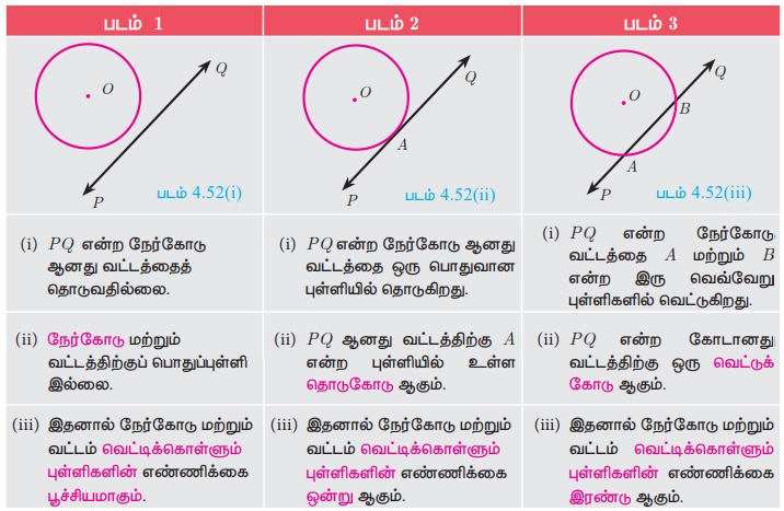 படம் 4.52 (iii)-யில் வட்டத்தின் மீது அமைந்திருக்கும் கோட்டுத்துண்டு AB-யானது வட்டத்தின் நாண் ஆகும். இதனால் நாண் என்பது வெட்டுக்கோட்டின் உட்பகுதியாகும்.