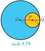 மையங்களுக்கு இடைப்பட்ட தொலைவு OP = d. படம் 4.58-லிருந்து இரு வட்டங்கள் உட்புறமாகத் தொட்டுக்கொள்வதால், OP = d = OQ – PQ