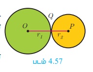 படம் 4.57-லிருந்து இரு வட்டங்கள் வெளிப்புறமாகத் தொட்டுக்கொள்வதால் OP = d = OQ + PQ = r1 + r2.