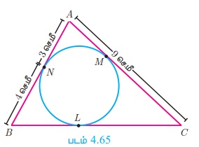 அருகிலுள்ள படம் 4.65-யில், ΔABC ஆனது ஒரு வட்டத்தைத் தொட்டுக்கொண்டு வட்டத்தைச் சுற்றி அமைந்துள்ளது எனில், BC-யின் நீளத்தைக் காண்க.