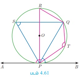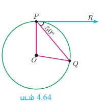படம் 4.64-யில், O ஆனது வட்டத்தின் மையம். PQ ஆனது ஒரு நாண் ஆகும். தொடுகோடு PR ஆனது நாண் PQ - வுடன் P -யில் 50° கோணத்தை ஏற்படுத்தினால், ∠POQ காண்க.