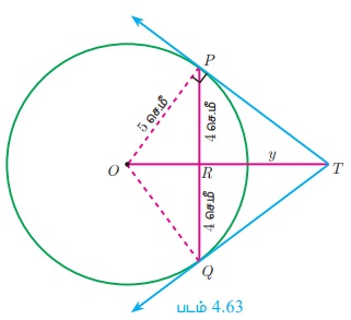 5 செ.மீ ஆரமுள்ள வட்டத்தில் PQ ஆனது 8 செ.மீ நீளமுள்ள நாண் ஆகும். P மற்றும் Q -வின் வழியே செல்லும் தொடுகோடுகள் T என்ற புள்ளியில் சந்திக்கிறது எனில், TP என்ற தொடுகோட்டின் நீளம் காண்க.