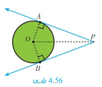 மேலும் OA = OB = ஆரம், OP ஆனது பொதுவான பக்கம், ∠AOP = ∠BOP எனவே, ΔOAP ≅ ΔOBP (ப.கோ.ப). ஆகவே PA = PB