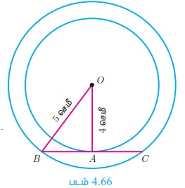 இரண்டு பொது மைய வட்டங்களின் ஆரங்கள் 4 செ.மீ, 5 செ.மீ ஆகும். ஒரு வட்டத்தின் நாணானது மற்றொரு வட்டத்திற்குத் தொடுகோடாக அமைந்தால் அவ்வட்டத்தின் நாணின் நீளம் காண்க. தீர்வு