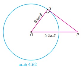 3 செ.மீ ஆரமுள்ள வட்டத்தின் மையத்திலிருந்து 5 செ.மீ தொலைவில் உள்ள புள்ளியிலிருந்து வட்டத்திற்கு வரையப்பட்ட தொடுகோட்டின் நீளம் காண்க.