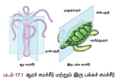 சமச்சீர்: இது உடல் உறுப்புகள் அமைந்துள்ள முறை ஆகும். இது இரு வகைப்படும். அவை: ஆரச் சமச்சீர் மற்றும் இருபக்கச் சமச்சீர். ஆரச் சமச்சீர் முறையில் விலங்குகளின் உடல் உறுப்புகள் ஒரு மைய அச்சினைச் சுற்றிலும் அமைக்கப்பட்டிருக்கும். உயிரியின் உடலை எந்த ஒரு திசையில் பிரித்தாலும் ஒத்த சமமான இரண்டு பாகங்களாக பிரிக்க முடியும். எ.கா: ஹைட்ரா,
