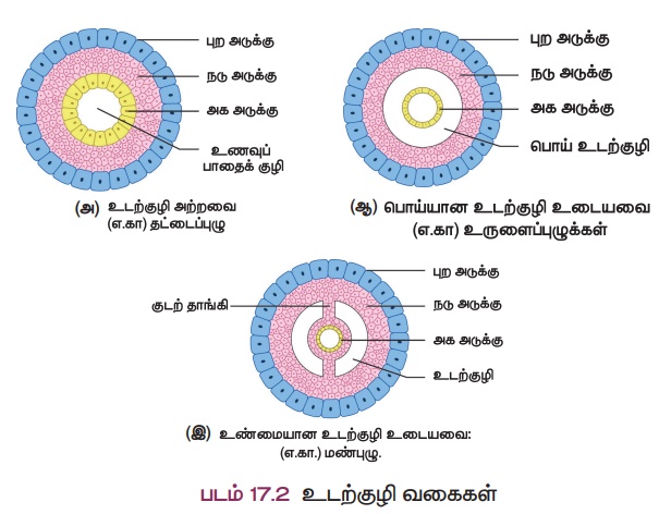 உடற்குழி: உடலினுள்ளே திரவத்தினால் நிரப்பப்பட்ட குழி உடற்குழி எனப்படும். இது உடல் சுவற்றிலிருந்து உணவுப்பாதையைப் பிரிக்கிறது. உண்மையான உடற்குழி அல்லது சீலோம் (Coelom) என்பது நடு அடுக்கினுள்ளே அமைந்துள்ளது. உடற்குழியின் தன்மையின் அடிப்படையில் விலங்குகள் மூன்று வகைகளாகப் பிரிக்கப்பட்டுள்ளன. அவை: